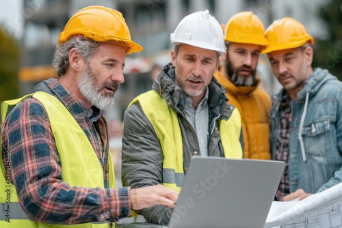 Construction team planning using a laptop and blueprints outdoors. Show teamwork, project management, and technology in architecture.