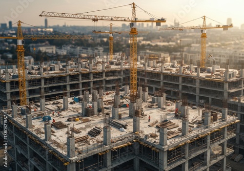 Construction technology banner background Construction site with cranes fittings and concrete