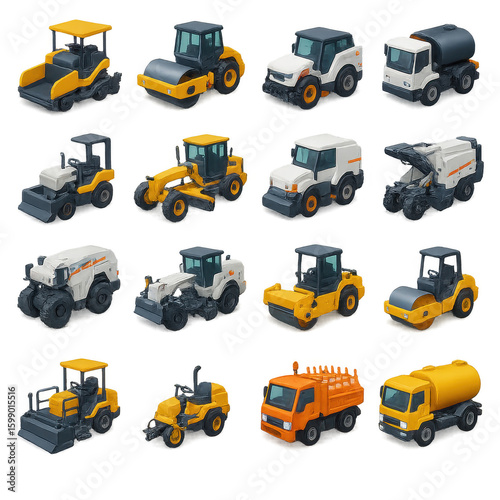 Construction vehicles 3d icon set. including bulldozer, excavator, mixer, grader, dump truck, roller, sweeper