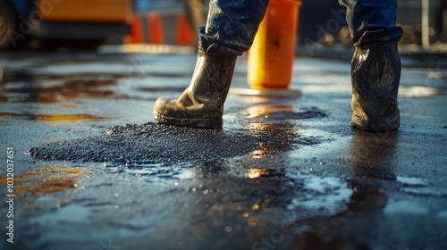 Construction Worker Applying Bitumen Mastic with Trowel on Flat Roof Surface in Industrial Setting