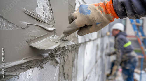 Construction Worker Applying Cement Plaster on Wall. Manual Plastering of Concrete Wall at Construction Site