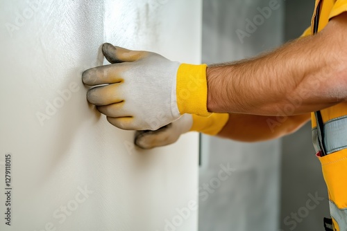 Construction worker applying finishing touches to a wall with gloved hands, showcasing craftsmanship and attention to detail in renovation projects, construction concept