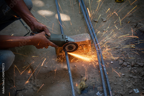 Construction worker. Cutting metal rod with grinder machine.