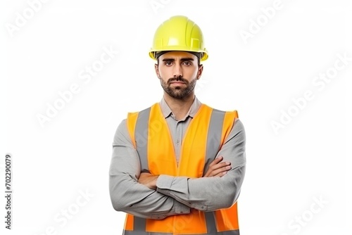 Construction worker, engineer with a safety vest and hardhat on white background. contractor or architect in planning or renovation. ai generative