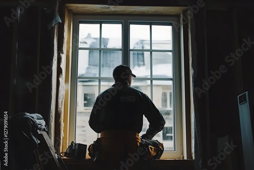 Construction Worker Gazing out of Window on Construction Site on Rainy Day
