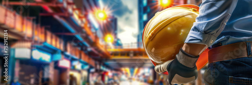 Construction Worker Holding Helmet in Front of Construction Site. Ensuring Safety and Preparedness for Industrial Development, Urban Progress, and Efficient Project Management in infrastructure