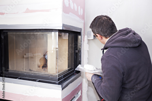 Construction worker imposes a finishing coat on fire. Finishing the fireplace. Putting plaster.