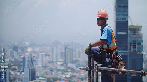 Construction Worker in Hard Hat and Safety Vest on Scaffolding with Blurred Cityscape Background, Symbolizing Modern Worker Conditions