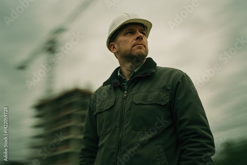 Construction worker in hard hat, standing at site with crane background on cloudy day.