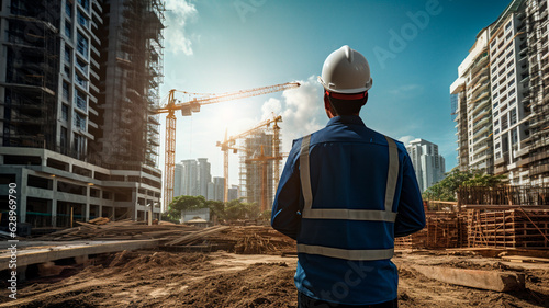 construction worker in helmet in front of construction site. Generative AI