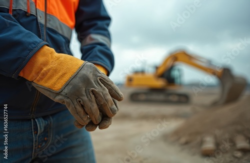 Construction worker in high-visibility jacket, gloves adjusts safety gear on job site. Yellow excavator machinery operates in background, emphasizing occupational health, safety protocols. Focus on