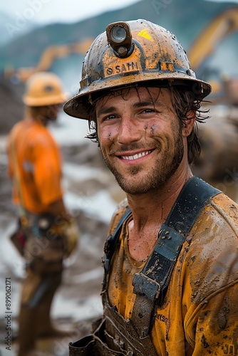 Construction worker in muddy site, mountains in background, bright light, smiling, medium shot