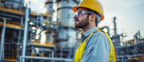 construction worker in safety helmet and goggles stands confidently at industrial site, showcasing dedication and professionalism in vibrant environment