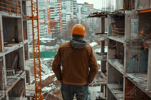 Construction worker in safety helmet inspecting construction site. Concept Construction Safety, Site Inspection, Worker Check, Helmet Protection, Construction Site