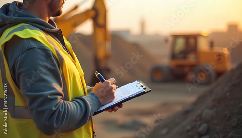 Construction worker in safety vest with clipboard inspecting site with excavator and gravel road at sunset.