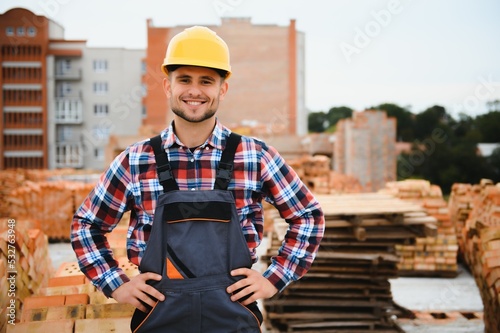 Construction worker in uniform and safety equipment have job on building