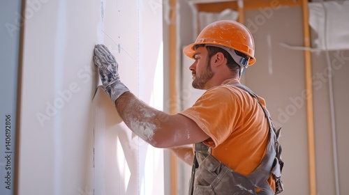 Construction worker installing drywall in a new home. Featuring drywall installation and homebuilding