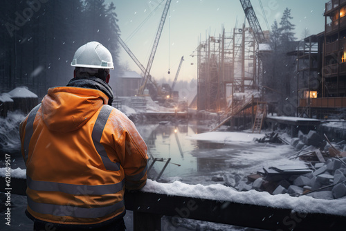 construction worker is looking at crane on the snow