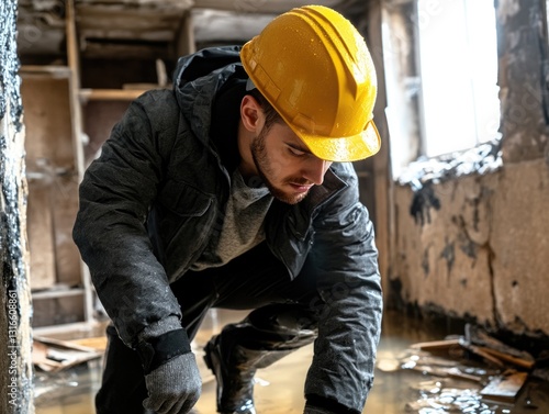 Construction worker kneeling down, looking into ceiling, assessing damage, wearing protective yellow helmet and work gear.