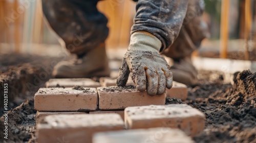Construction worker laying bricks for a foundation. Featuring skill and foundation work