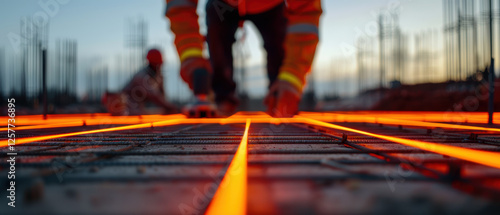 Construction worker laying reinforced concrete with glowing lines at sunset.