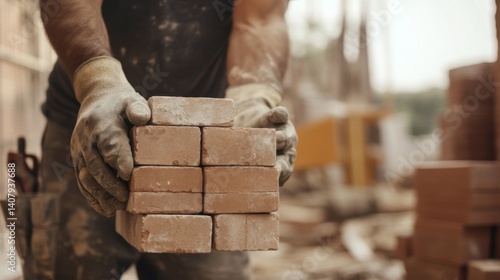 Construction worker lifting bricks at a building site. Featuring strength and effort