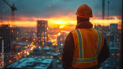 Construction Worker Looking at Cityscape at Sunset - Realistic Image