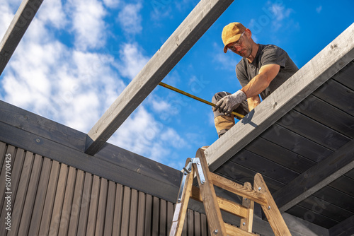 Construction Worker Measures Wooden Beams on a Sunny Day Near a Modern Building Under Renovation