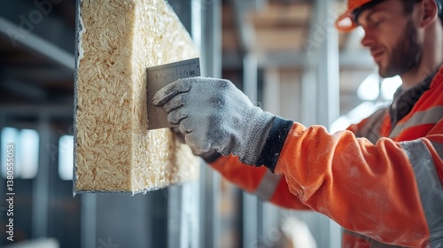 Construction Worker Measuring Insulation Board on Building Framework Indoors