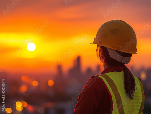 Construction worker observing the sunset over a city skyline while wearing safety gear on a warm autumn evening