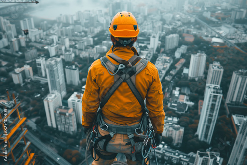 construction worker on a construction site: construction worker in an orange jacket and helmet stands on a skyscraper overlooking the city