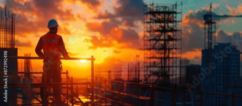 Construction worker on building site at sunset. Urban background. Banner with copy space