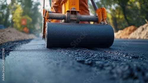 Construction worker operating a compact roller to smooth out asphalt. Featuring efficiency and smoothness