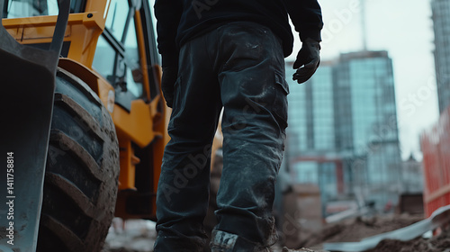 Construction worker operating a skid steer loader on a construction site. Featuring machinery and precision