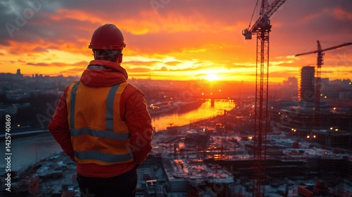 Construction worker overlooking construction site at sunset with cranes and city skyline in background