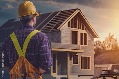 Construction worker overseeing new home build during sunset