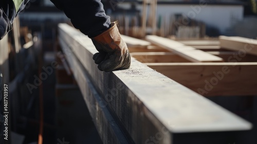 Construction worker placing beams on construction site. Featuring strength and coordination