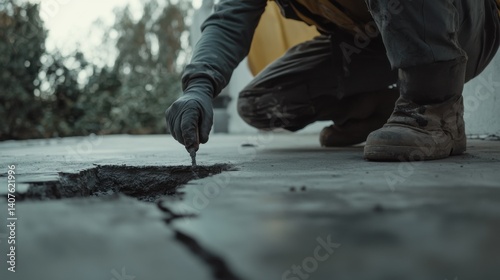 Construction worker sealing a foundation crack with epoxy. Featuring detail and care