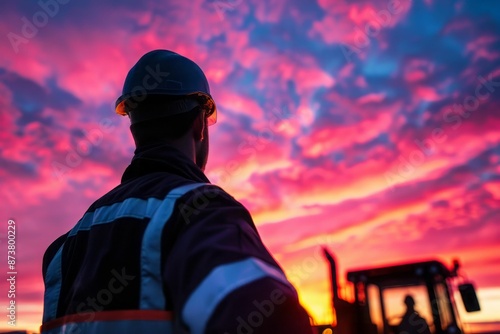 Construction Worker Silhouetted Against Dramatic Sunset.
