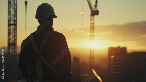 Construction Worker Silhouetted Against Sunset and Crane