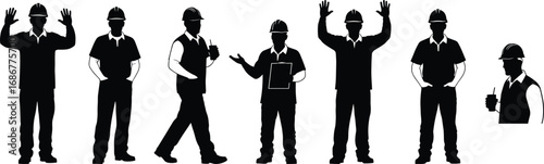 Construction worker silhouettes illustration showing men wearing safety helmets and vests in different poses representing industry, labor, teamwork, engineering, building work.