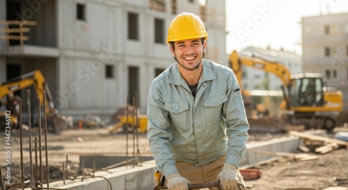 Construction worker smiling at construction site with buildings and heavy machinery.