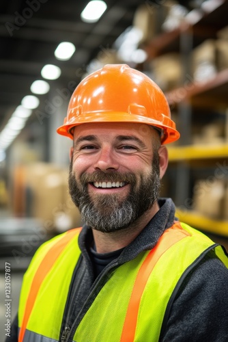 Construction worker smiling in safety gear, orange hard hat and reflective vest in warehouse, representing teamwork, productivity, and workplace safety in logistics.