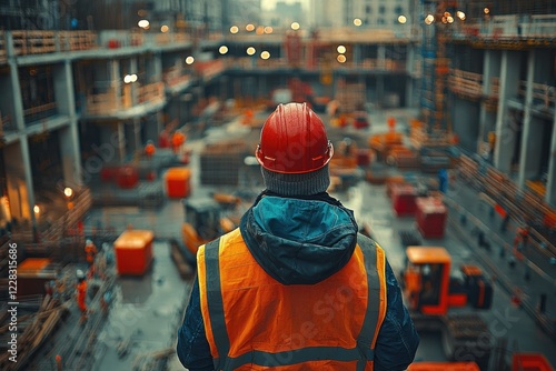 Construction worker surveys job site during early evening at a bustling urban construction project