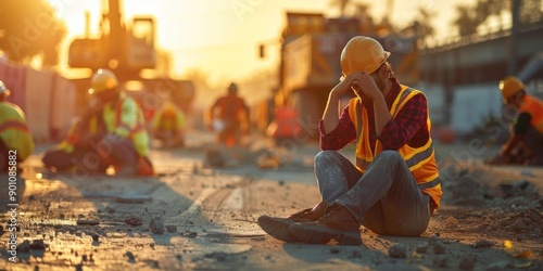 Construction worker taking a break, sitting on the ground with other workers and machinery in the background at a construction site during sunset.