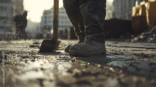 Construction Worker Using a Shovel on Wet Concrete