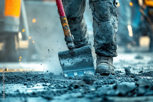 Construction worker using jackhammer to break concrete at urban construction site action shot capturing heavy machinery in motion industrial environment close-up view