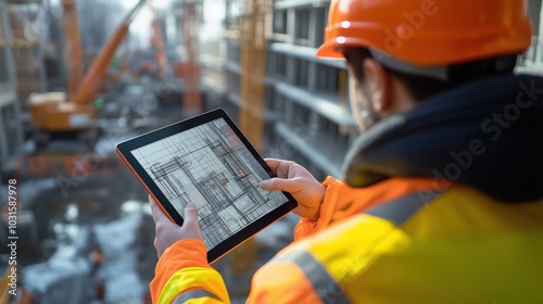 Construction Worker Using Tablet at a Building Site. Construction worker wearing a safety helmet and bright clothing uses a tablet to review building plans at an active construction site.