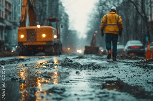 Construction worker walking along a wet, muddy street amidst excavators, digging machinery, and blurred cityscape in rainy weather conditions
