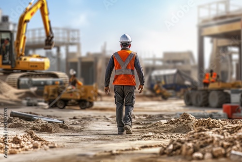 Construction Worker Wearing Safety Uniform, Engineering Works on Building Construction Site, Civil Engineer Observes and Checking the Project